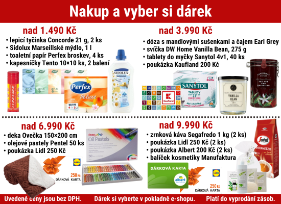 Nakupte v našem e-shopu některý z vybraných produktů Esselte po kliknutí na banner. Za 30 jakýchkoliv produktů obdržíte úložný box s víkem Leitz MyBox. Za 100 jakýchkoliv produktů pak mixér TEFAL MIX & MOVEL ZDARMA! Jděte na stránku akce Esselte, kde naleznete podrobná pravidla, nahrajte svůj prodejní doklad a zažádejte o zaslání dárku - mixéru TEFAL MIX & MOVEL nebo úložného boxu s víkem Leitz MyBox. V případě závěsných a zakládacích obalů je jedním produktem jedno balení. Akce platí do 31.3.2026.